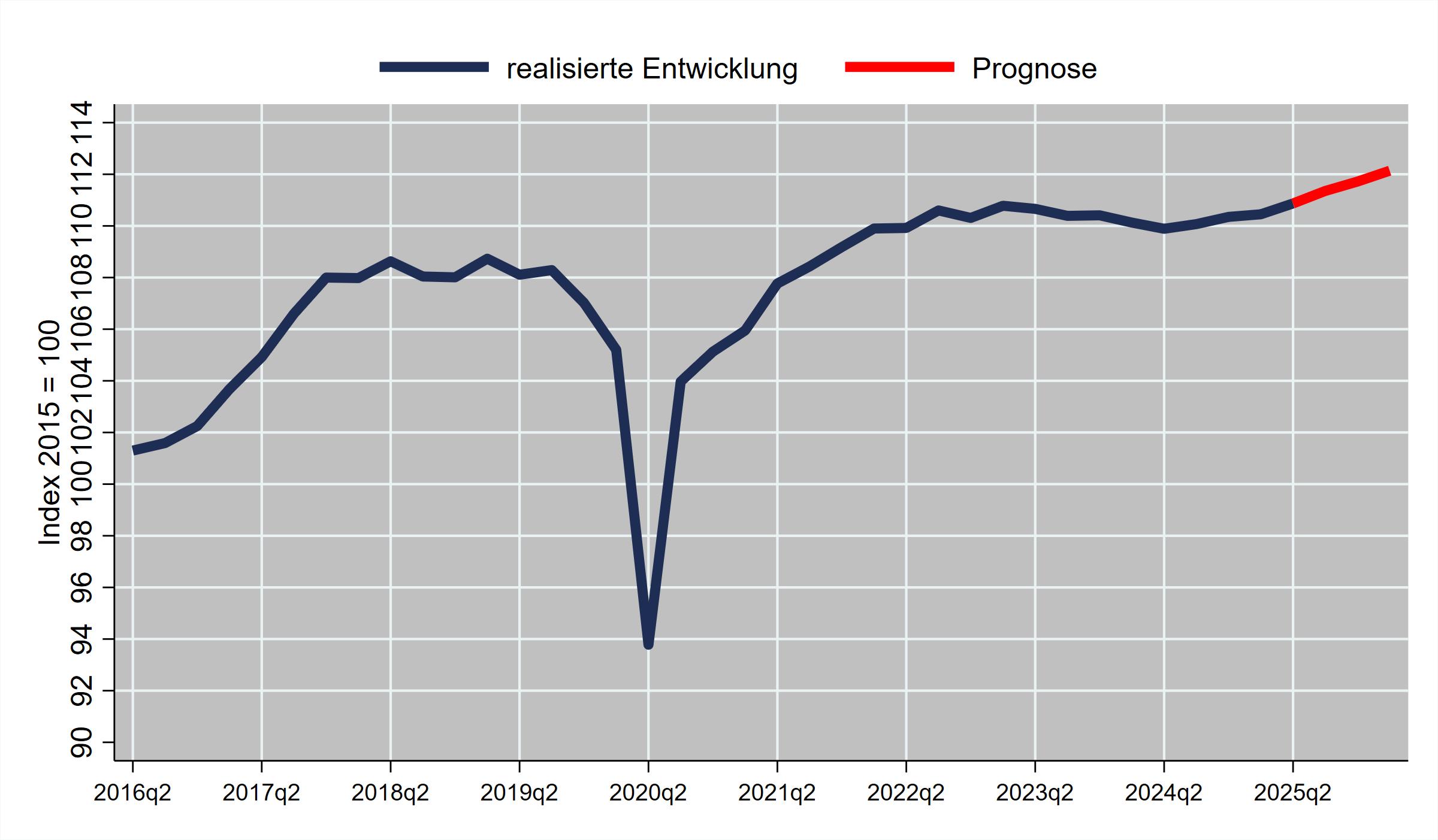 © IAW und Universität Hohenheim 2025. Datenquellen: 2016q2 bis 2025q2: Statistisches Landesamt und Ministerium für Wirtschaft, Arbeit und Tourismus Baden-Württemberg; 2025q3 bis 2026q1: IAW und Universität Hohenheim; eigene Berechnungen. Die Daten sind preis-, saison- und arbeitstäglich bereinigt.