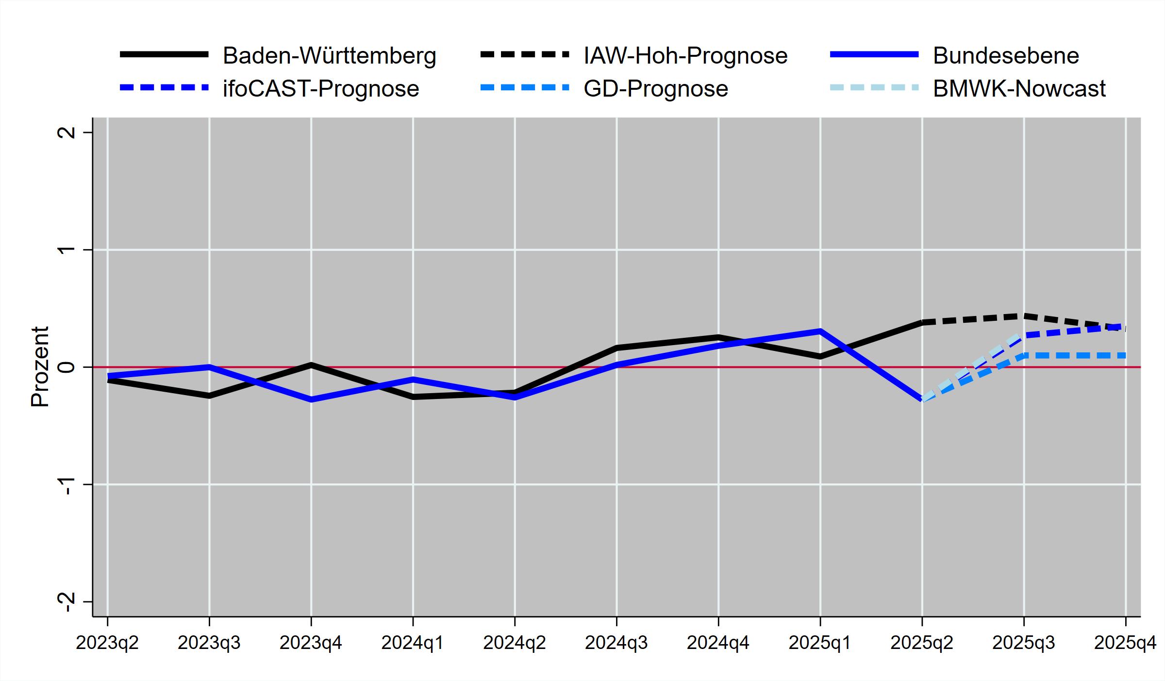 © IAW und Universität Hohenheim 2025. Datenquellen für Baden-Württemberg: 2023q2 bis 2025q2: Ministerium für Wirtschaft, Arbeit und Tourismus Baden-Württemberg; 2025q3 bis 2025q4: IAW und Universität Hohenheim; eigene Berechnungen. Datenquellen für die Bundesebene: 2023q2 bis 2025q2: Statistisches Bundesamt; 2025q3 bis 2025q4: ifoCAST, Arbeitsgemeinschaft Gemeinschaftsdiagnose 2025, BMWK 2025. Alle Daten sind preis-, saison- und arbeitstäglich bereinigt, Saisonbereinigung der VGR-Werte nach X13 JDemetra+.