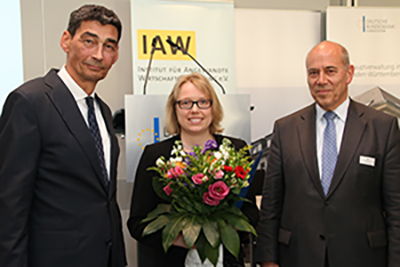 F.l.t.r.: Mr Bernhard Sibold [President of the Head Office of the Deutsche Bundesbank in Baden-Württemberg], Ms Susanne Wellmann and Prof. Dr. Wilhelm Rall [Chairman of the IAW e.V.]