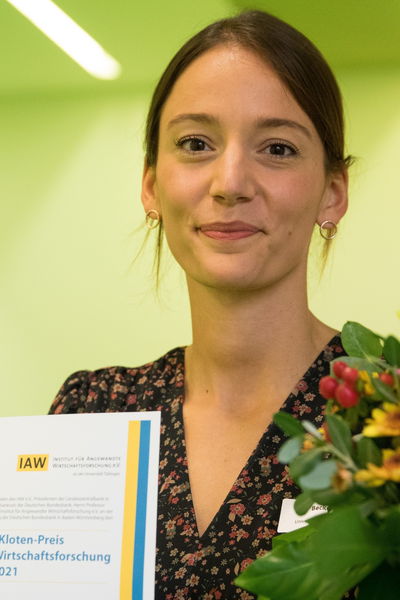 The prize was awarded to Ms. Carina Haller in recognition of her outstanding Master's thesis Residential Energy Consumption of German Low-Income Households: The Influence of Social Benefit Transfers under Prof. Dr. Martin Biewen at the Chair of Statistics, Econometrics and Quantitative Methods at the Faculty of Economics and Social Sciences at the Eberhard Karls University of Tübingen.