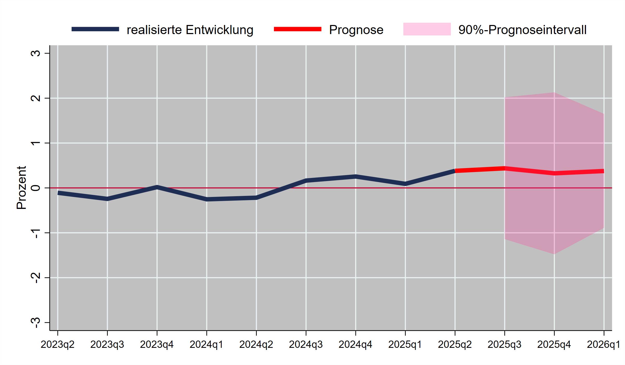 © IAW and University of Hohenheim 2025. Data sources: 2023q2 to 2025q2: Ministry of Economy, Labour and Tourism; 2025q3 to 2026q1: IAW and University of Hohenheim, own calculations. The data are adjusted for price, seasonal and working-day effects.